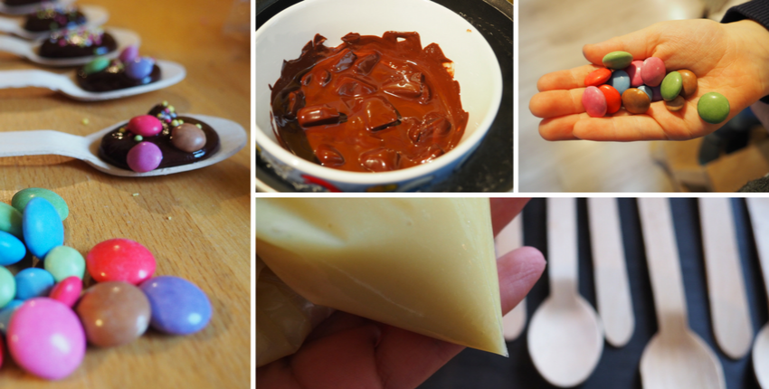 Il suffit de faire fondre le chocolat au bain marie ou au micro-onde, une fois fondu verser du chocolat dans les cuillères avec une poche à douille ou une autre cuillère, puis déposer les smarties et sucres colorés. Laisser refroidir et durcir. MIAM !