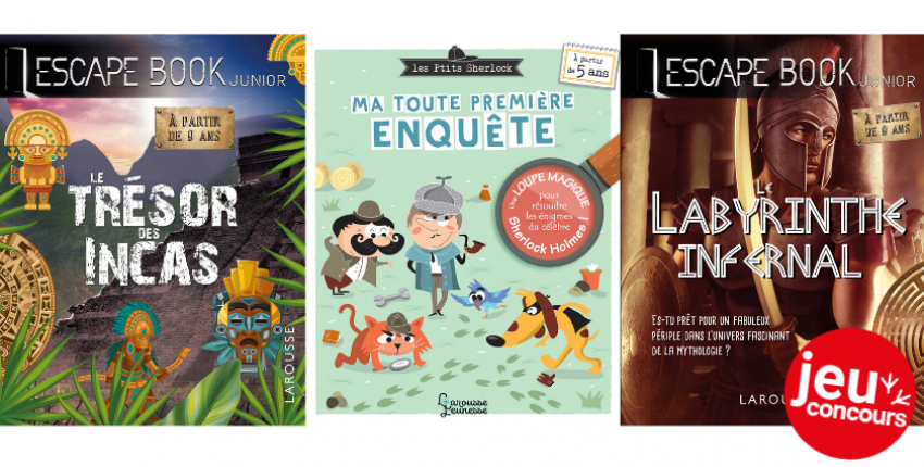 Les éditions Larousse vous proposent de gagner un de ces trois derniers livres d'enquêtes et d'aventures. Dès 5 ans ou avec les 9-12 ans, faites découvrir à vos enfants les plaisirs de se plonger dans un grand et beau livre divertissant où la lecture se mêle au jeu et à le réflexion. Pour en sortir plein de fierté d'avoir résolu le mystère...