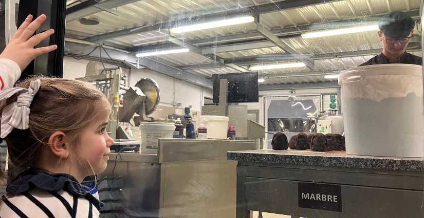 Puis, nos kidi-reporters découvrent avec joie et intérêt les différentes étapes de la fabrication du chocolat. À travers les vitres mais aussi au cœur de l’atelier, ils peuvent admirer les différentes machines ainsi que artisans chocolatiers en plein travail. La visite est ponctuée de plusieurs moments de dégustation : si l'amertume du grué de cacao ne rencontre pas un franc succès, la dégustation du praliné leur redonne rapidement le sourire !
